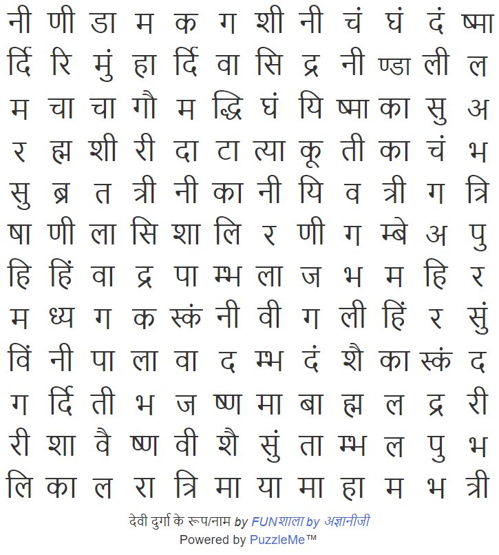 माँ दुर्गा के बहुत से नाम हैं। उनके 25 नाम इस अक्षर संजाल (ग्रिड) में छिपाए गए हैं। एक प्रयास कीजिए कि आप कितने नाम ढूंढ पाते हैं।